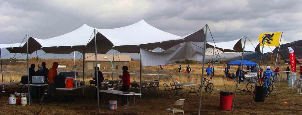 Cyclocross season in Victor, Idaho comes each fall and Peak Stretch Tents offers sporting event location tents for athletes and judging to get out of the elements. In cyclecross the nastier the weather the happier these folks are…unnatural to be sure! One thing is for sure though, when they are done they want out of the Teton elements fast! Peak Stretch Tents provides a totally unique opportunity since we can batten down up to 4 sides to prevent the elements from entering the open space.